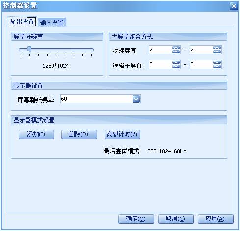 2、單擊 “拼接”按鈕 ,出現(xiàn)如圖3所示對(duì)話框。根據(jù)實(shí)際應(yīng)用情況,選擇合適的屏幕分辨率,大屏幕組合方式及屏幕刷新頻率,點(diǎn)擊 “應(yīng)用 — 確定” 。