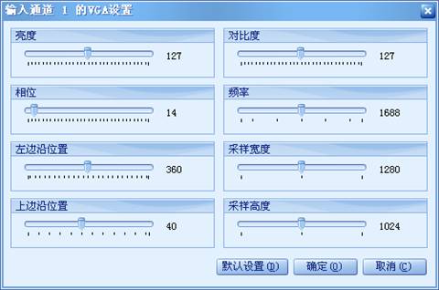 關(guān)于輸入源的類型。若使用DVI或視頻輸入,則直接應(yīng)用就可以。如果選擇VGA輸入,需單擊“VGA輸入屬性”圖標(biāo),出現(xiàn)如圖5所示界面。通常情況下,用戶不需要去調(diào)節(jié),或只對(duì)“左邊沿位置”和“上邊沿位置”以及“相位“進(jìn)行微調(diào)即可,其他參數(shù)不建議用戶去更改。如果用戶不小心錯(cuò)誤調(diào)節(jié)了這些參數(shù),可以點(diǎn)擊“默認(rèn)設(shè)置 — 應(yīng)用” ,即可恢復(fù)默認(rèn)設(shè)置。